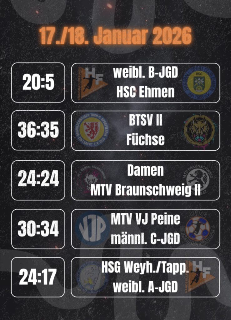 Die Tabellenführung unserer Herren hatte leider nur kurz Bestand, im Auswärtsspiel beim BTSV Eintracht II gab es eine verdiente und ernüchternde 35:36 Niederlage. Der Auftritt unserer Füchse war zahnlos und fast schon ängstlich, es fehlte in den meisten Aktionen das nötige Selbstvertrauen. „Wir spielen zur Zeit nicht wie eine Mannschaft die oben steht, sondern wie eine die gegen den Abstieg spielt“, musste Coach Maik sehr ernüchternd zugeben. Zunächst plätscherte die Partie noch auf Augenhöhe vor sich hin und kein Team war besser als das andere (3:3 8., 7:5 14., 9:9 18.). Doch dann ließen sich unsere Herren immer mehr überrennen und fassten hinten kaum noch zu. „Das reicht dann halt nicht gegen einen Gegner der aus seinen Möglichkeiten alles herausholt“, beendete Maik sein Fazit. Die Folge war eine 19:15 Halbzeitführung für die Gastgeber. Der Start in Halbzeit zwei dürfte dann auch den letzten Anwesenden den Glauben auf Punkte geraubt haben, nach 2:11 Minuten stand es 22:15 für die Löwen. Eventuell wähnten sich dann auch die Gastgeber schon als sichere Sieger, denn wenige Minuten später waren unsere Füchse wieder auf Tuchfühlung (24:22 38.). Diese kurze Phase, in der die Möglichkeiten unserer Truppe aufblitzten, konnte an diesem Tag aber nicht aufrecht erhalten werden. Die Braunschweiger brachten wieder fünf Tore zwischen sich und unserem Rudel (28:23 44.) – und dennoch war das Spiel noch nicht durch. Die Moral bei unseren Füchsen stimmt, das muss man ihnen zu Gute halten. Und so entwickelte sich – handballerisch an diesem Tag eigentlich unerklärlich – erneut eine enge Schlussphase. Zweieinhalb Minuten vor dem Ende steht es 36:32 für die Gastgeber, unsere Jungs verkürzen 51 Sekunden vor Schluss auf 36:34 und gewinnen tatsächlich noch mal den Ball. Die Zeit reicht allerdings nur noch für das 36:35 neun Sekunden vor dem Abpfiff. Man muss letzten Endes einfach zugeben, dass das Unentschieden an diesem Tag nicht verdient gewesen wäre. „Wir schlafen eine Nacht drüber und haben Bock auf die nächsten Einheiten und vor allem das Heimspiel (am 24.01. um 18:30 Uhr gegen Zweidorf/Bortfeld II [Anm. d. Red.]) – dann wieder mit unserem Spiel“, blickt Maik abschließend schon voraus.