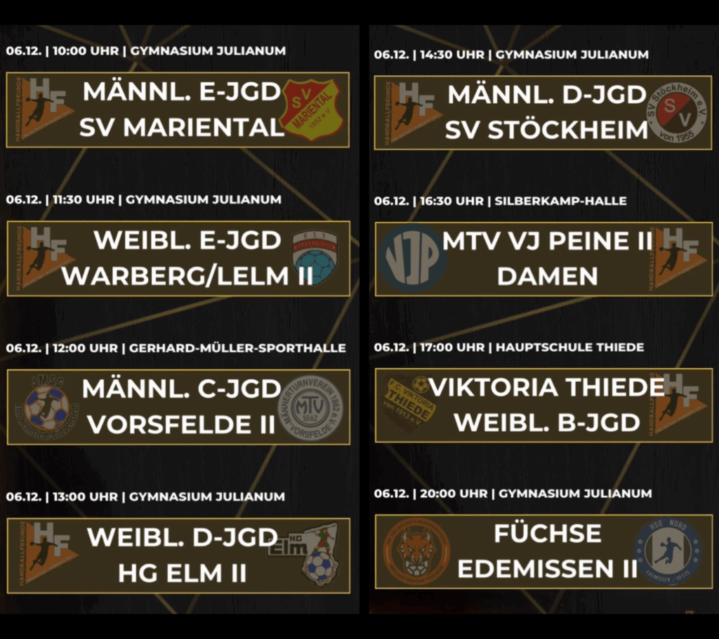 Samstag ist nicht nur Nikolaus, sondern auch ein vollgepackter Spieltag. Bis auf die weibliche A-Jugend sind alle unsere Teams im Einsatz, fünf davon zu Hause im Julianum.