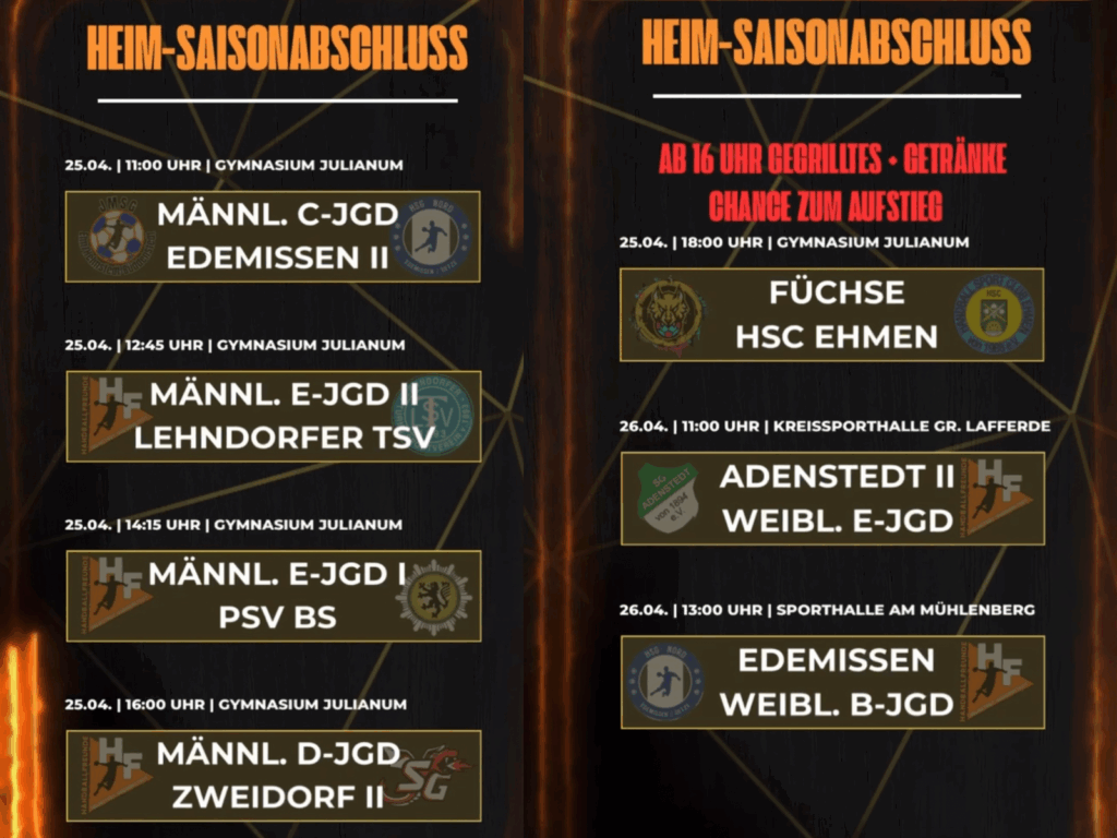 Der letzte Heimspieltag steht bevor und wir möchten mit euch den Saisonabschluss feiern. Ab 16:00 Uhr werden wir euch mit Gegrilltem und Getränken versorgen. Sportlich geht’s aber bereits um 11:00 Uhr mit einem durchaus interessanten Spiel los. Unsere männliche C-Jugend (Platz 4) empfängt die HSG Nord Edemissen/Uetze II (Platz 3) und könnte mit einem Sieg in der Tabelle an den Gästen vorbeiziehen. Beide Mannschaften hätten dann die selbe Punkteausbeute, doch vor dem Torverhältnis (aktuell HF +43, HSG +66) zählt zunächst der direkte Vergleich. Da das Hinspiel mit 33:36 verloren wurde, müssten unsere Jungs nun mit mindestens vier Toren Vorsprung gewinnen.